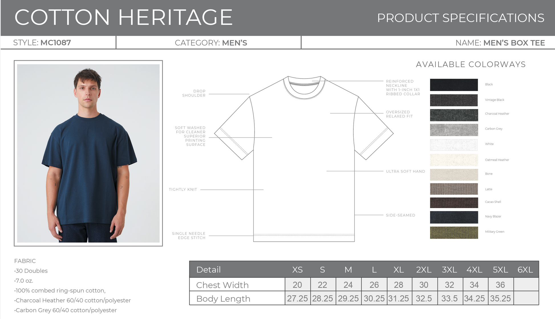 FEATURES Oversized relaxed fit, drop shoulder, single needle edge stitch, reinforced neckline with 1-inch 1x1 ribbed collar , ultra soft hand, side- seamed, tightly knit, superior printability.